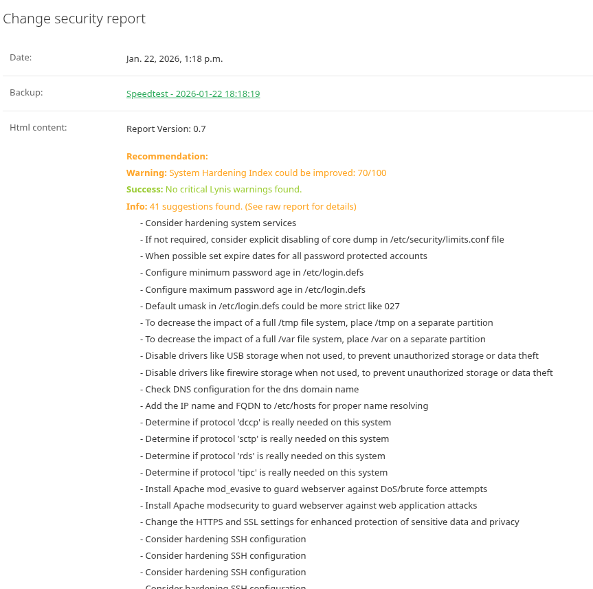Although it’s not yet in production, I have Ubuntu Server and AlmaLinux (RHEL) running security reports in the development environment. The results are promising. While some of the hardening recommendations are a bit overkill for our specific use case, having that visibility is incredibly useful. If we have the time to harden them, why not?